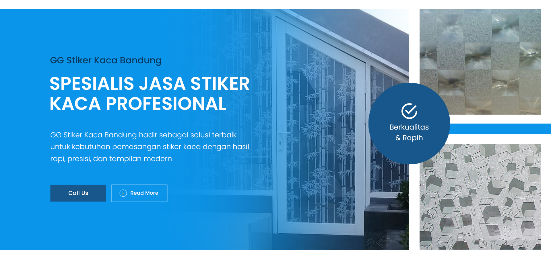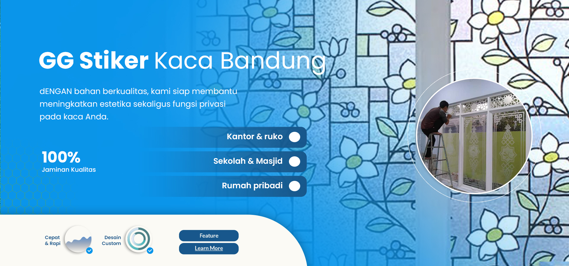 GG Stiker Kaca Bandung hadir sebagai solusi terbaik untuk kebutuhan pemasangan stiker kaca dengan hasil rapi, presisi, dan tampilan modern. Kami melayani berbagai kebutuhan stiker kaca untuk rumah, kantor, toko, ruko, hingga gedung komersial di wilayah Bandung dan seluruh Jawa Barat. Dengan pengalaman dalam menangani berbagai proyek, kami memahami pentingnya kualitas hasil akhir yang tidak hanya menarik secara visual, tetapi juga memberikan fungsi maksimal sesuai kebutuhan pelanggan. Setiap pemasangan dilakukan dengan standar kerja profesional sehingga menghasilkan tampilan yang bersih, elegan, dan tahan lama.
